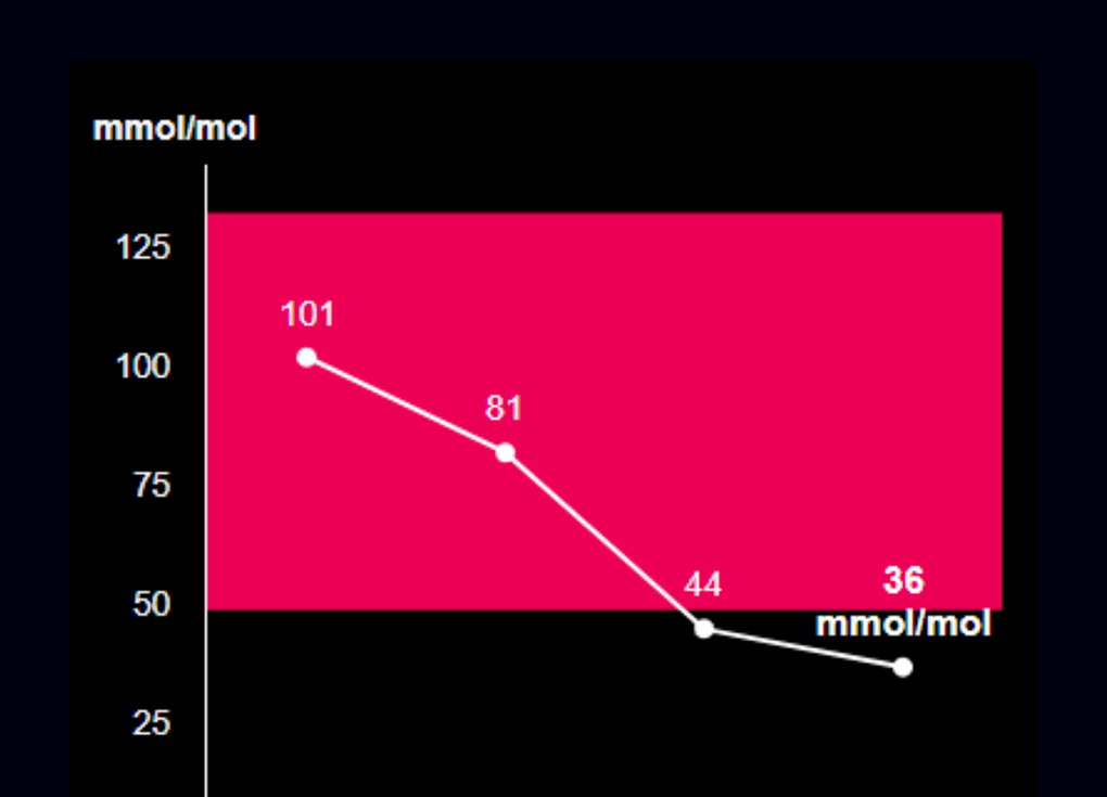 Kombinationen af god medicin og sund kost, med deraf følgende vægttab, har gjort sit tydelige arbejde. Langtidsblodsukkeret er faldet for hver prøvetagning. I slut september 2025 var det 36.