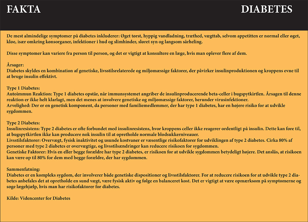 Læger, sygeplejersker og diætister med speciale i diabetes har undersøgt, behandlet og rådgivet løbende hen over perioden, imens jeg selv har varetaget målinger af blodsukker-værdier på daglig basis.
